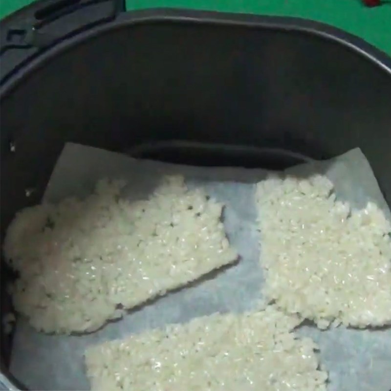 Sau khi cơm vừa nguội, bạn xếp cơm vào khuôn hoặc đĩa lớn để chống nóng, dàn đều cho đến khi miếng cơm dày khoảng 1/4 đốt ngón tay (khoảng 1-1,5 cm). Khi vo xong không nên ấn quá mạnh tay vì như vậy cơm có thể bị xẹp, khi chiên sẽ không nở ra.