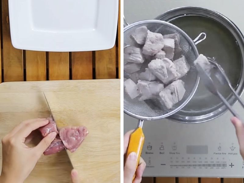 - Tiếp theo cắt phần thịt heo đã rửa thành những miếng vừa ăn khoảng 1 lóng tay.