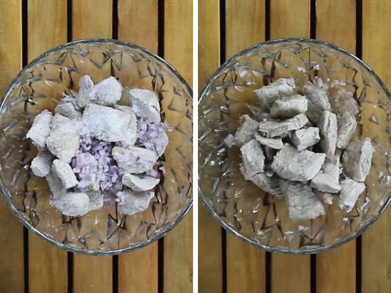 Trong cách chế biến chà bông thịt heo này, bạn có thể ướp thịt cùng với 3 2 muỗng canh đường, 1 muỗng cà phê hạt nêm, muỗng canh nước mắm, 1 muỗng cà phê tiêu và một ít hành tím băm nhuyễn. Sau khi cho thịt và gia vị vào ướp, tiến hành trộn đều và chờ khoảng 15 phút cho thịt thấm gia vị.