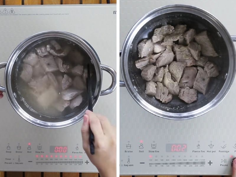 - Sau đó, cho nồi lên bếp mở lửa vừa, thêm 1 lít nước nấu sôi. Đến khi nước bắt đầu sôi, cho thịt heo vào luộc khoảng 8 - 10 phút. Trong quá trình luộc thịt cần chú ý vớt sạch bọt nếu có. Cuối cùng vớt ra rửa lại nước sạch và để ráo.