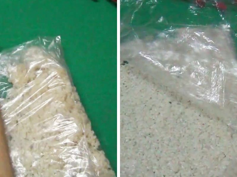 Bước 2: Cho cơm đã trộn vào túi đựng thực phẩm rồi dùng thanh cán bột cán dẹt cơm thành tấm có độ dày khoảng 1 cm.