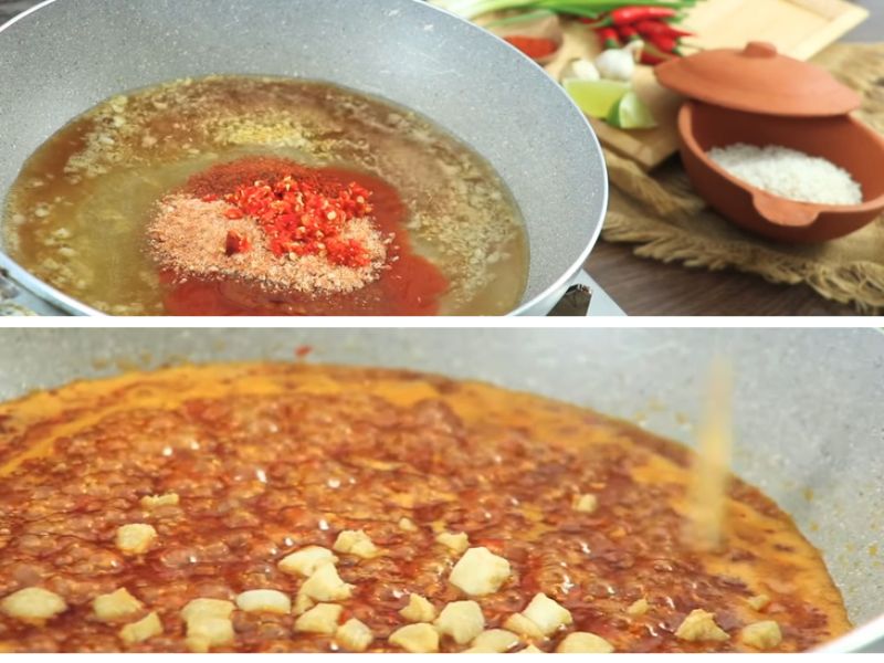 - Bước 3: Pha sốt với mỡ hành (đây là hỗn hợp để rưới lên cơm cháy gạo lứt)
